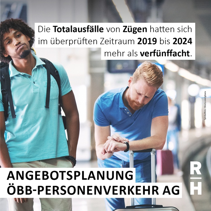 Der Rechnungshof bemängelt auch die Zunahme von Zugausfällen. Im überprüften Zeitraum hatten sich die Totalausfälle mehr als verfünffacht (plus 446 Prozent) – 2024 fielen 22.183 Züge aus. Personalbedingte Zugausfälle waren im Vergleich zur gesamten Anzahl der Zugfahrten gering: Im Jahr 2023 standen den mehr als 1,8 Millionen Zugfahrten der ÖBB-Personenverkehr AG 1.174 personalbedingte Zugausfälle gegenüber.